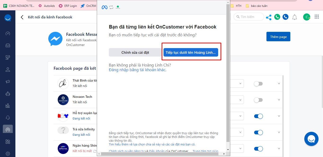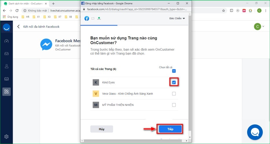 Continue to select the Fanpage you want to connect to Livechat => Click Continue.